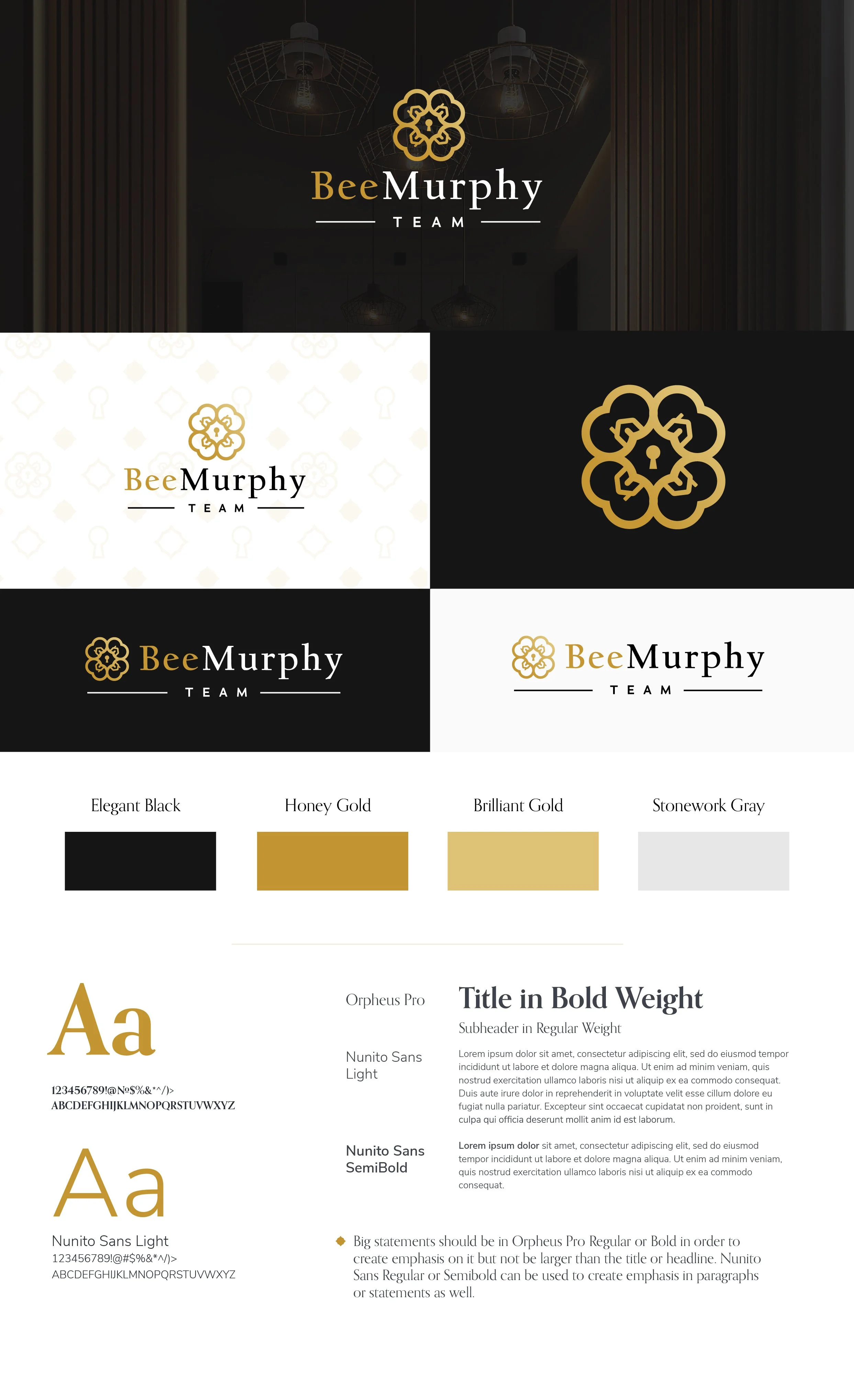 I was given a few requirements by BeeMurphy to create the brand; must signal a high quality and premium look, needs to relate top the Duo’s Last Names (Bee, Murphy), really want an elegant gold look.